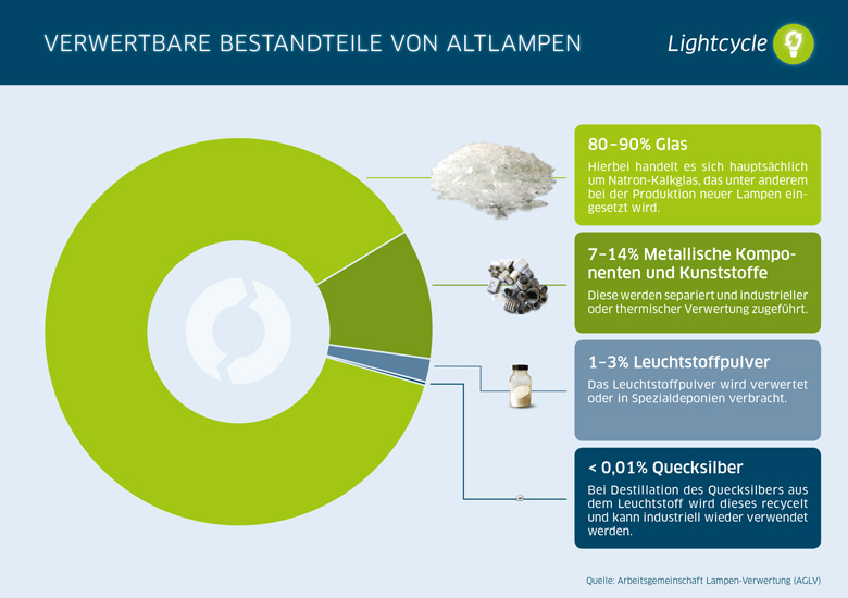 Nach dem Zerkleinern der Lampen werden die größeren Metallteile (z.B. Endkappen von Leuchtstoffröhren) in einer Magnettrommel von den anderen Materialien getrennt. Quecksilber und Leuchtstoffe werden dann in einem so genannten Vibro-Becken vom Glasbruch getrennt und anschließend durch Sedimentation und Drehrohrdestillation abgetrennt. Das Ergebnis ist bis zu 99,9 Prozent reines Quecksilber, das der Wiederverwertung zugeführt wird, zum Beispiel in der Lampen- oder Chemieindustrie. Das verbleibende Glasscherbengemisch kann anschließend in seine verschiedenen Fraktionen getrennt werden: Natron-Kalk-Glas, Bleiglas und Metalle.